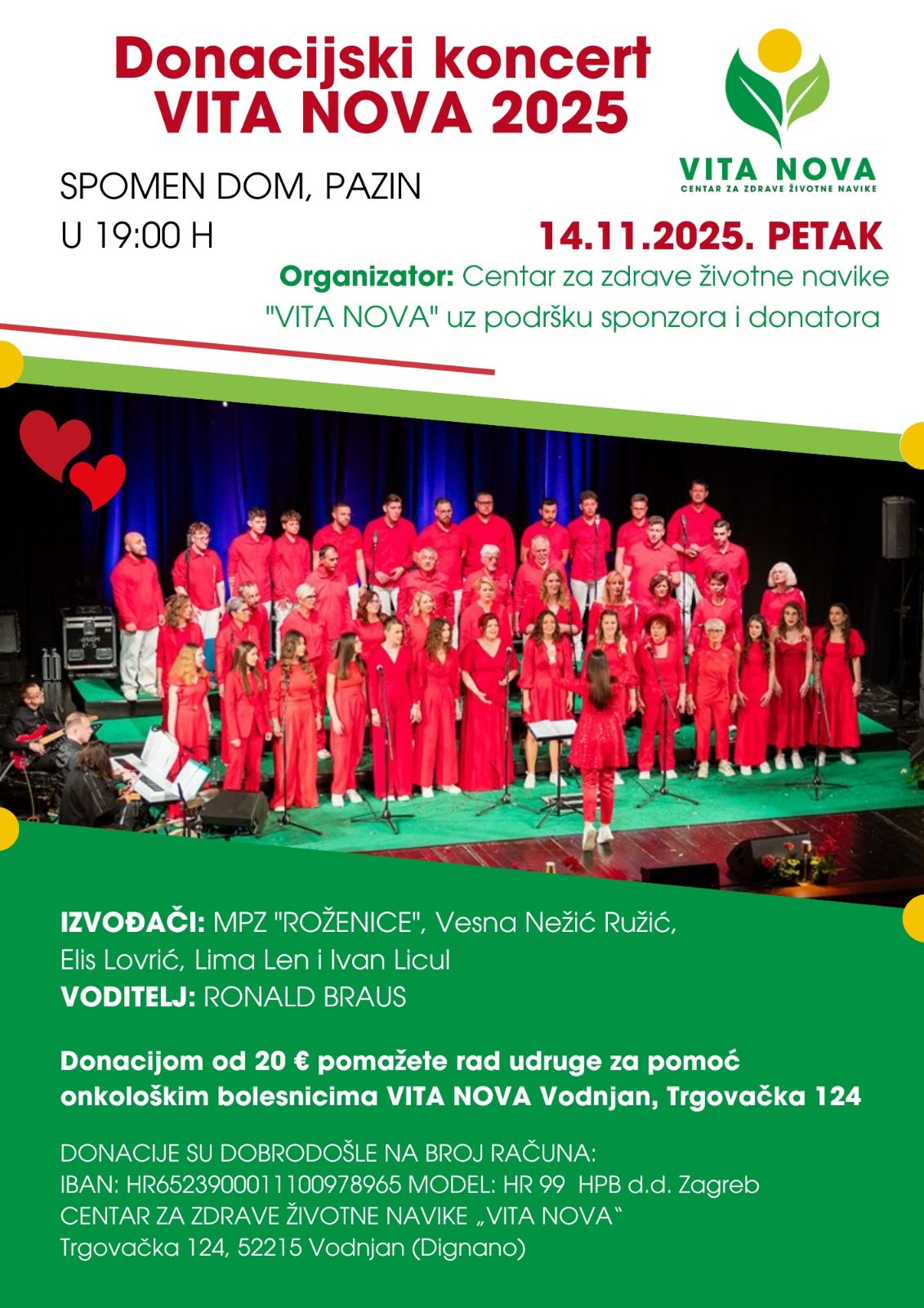 sa velikim zadovoljstvom najavljujemo i POZIVAMO vas na Donacijski koncert "VITA NOVA 2025.", u suradnji sa Mješovitim pjevačkim zborom "Roženice" Pazin, koji će se održati u petak, 14.11.2025. u Spomen domu Pazin, s početkom u 19 sati.